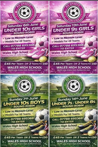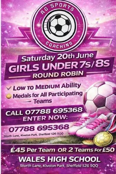 June football round robin tournament at Wales High School for boys and girls U7 to U10 teams, entry £45 per team with medals for all participants.